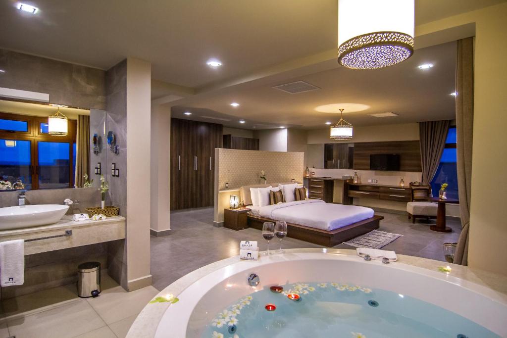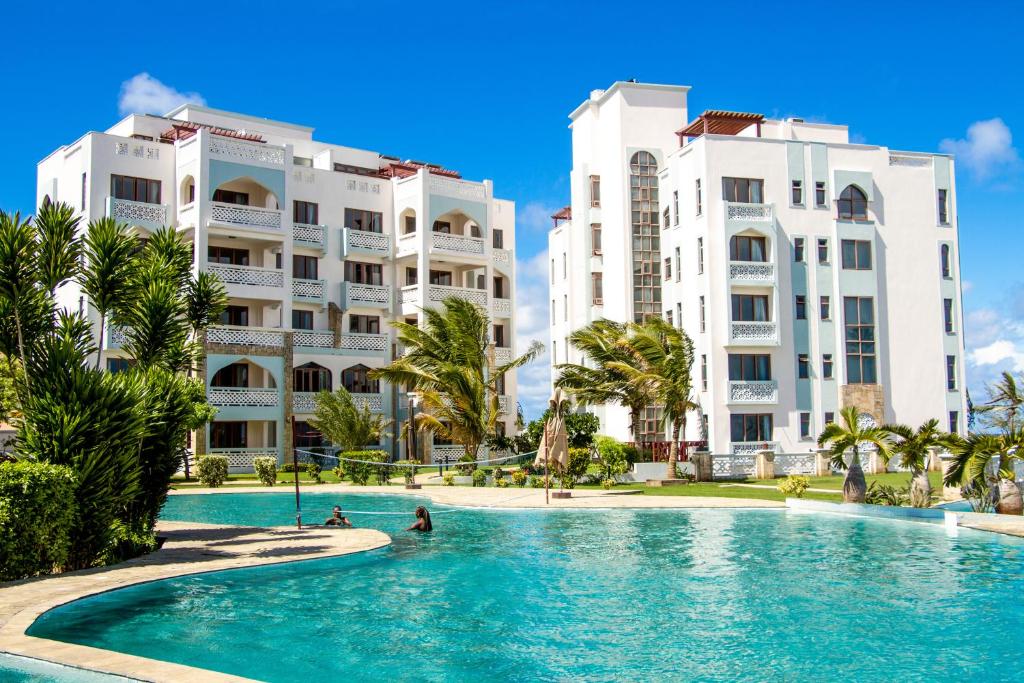 Facing the seafront, The Royal Shaza Suites is an apartment featuring a 5-star accommodation in Shanzu. It has a private beach area, infinity pool and private parking. Both free WiFi and parking on-site are accessible at the apartment free of charge. The apartment features family rooms and facilities for disabled guests. All units at the apartment complex come with air conditioning, a seating area, a flat-screen TV with streaming services, a safety deposit box and a private bathroom with a walk-in shower, bathrobes and free toiletries. Some units have a terrace and/or a patio with sea views and an outdoor dining area. At the apartment complex, each unit has bed linen and towels. The Royal Shaza Suites serves a buffet and à la carte breakfast and breakfast in the room is also available. Guests can grab a bite to eat in the in-house family-friendly restaurant, which specialises in African cuisine and also offers vegetarian, dairy-free and halal options. A variety of wellness packages are available for guests to get rejuvenated on-site. For guests with children, the accommodation features kids pool, an indoor play area and a children's playground. The apartment has a picnic area where you can spend a day out in the open. Popular points of interest near The Royal Shaza Suites include Shaza Beach, La Mera Beach and Shanzu Beach. Moi International Airport is 28 km from the property, and the property offers a paid airport shuttle service.